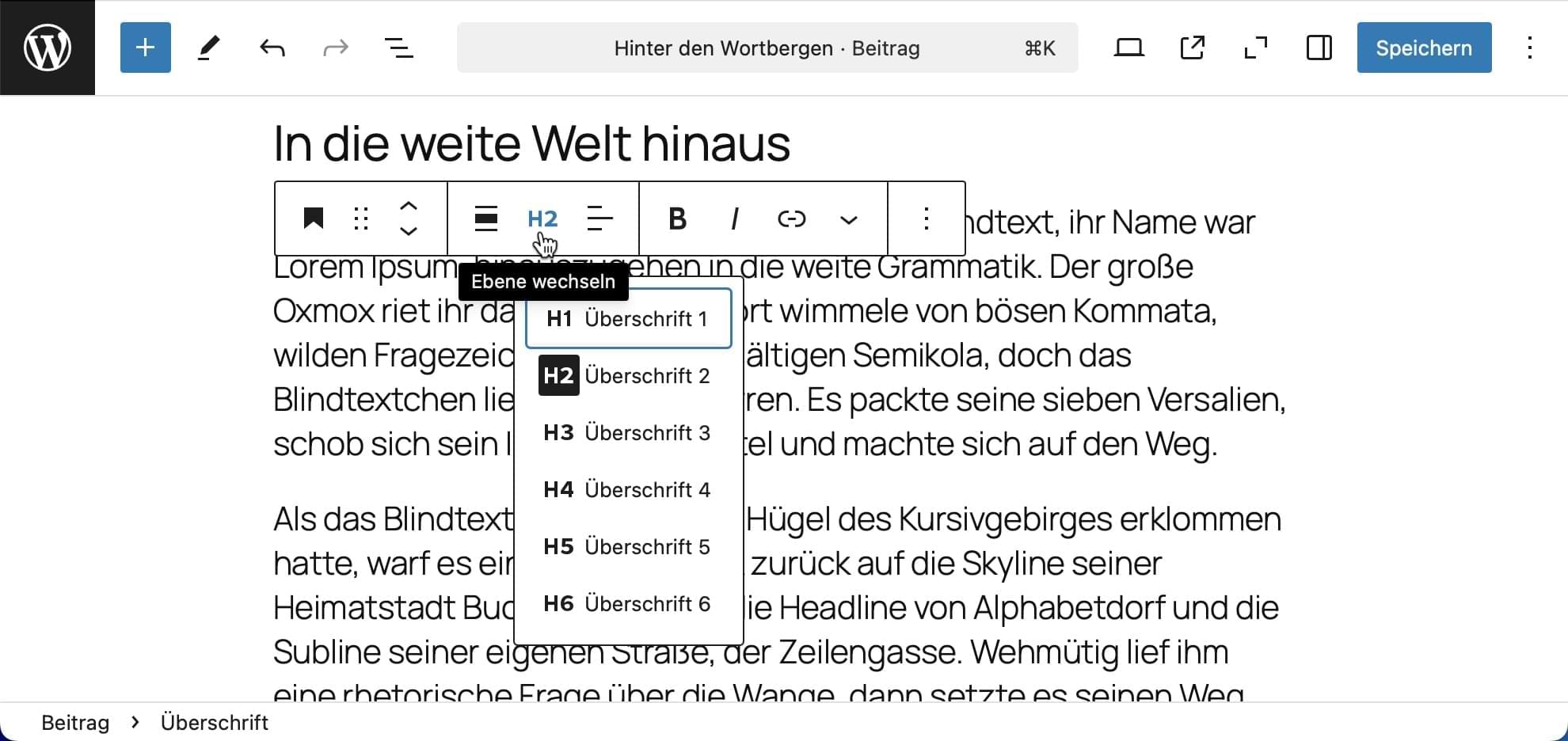 Die erste Gliederungsebene H1 ist normalerweise für den Titel des Dokuments reserviert, sodass Zwischenüberschriften im Beitrag immer mit der Ebene H2 beginnen.