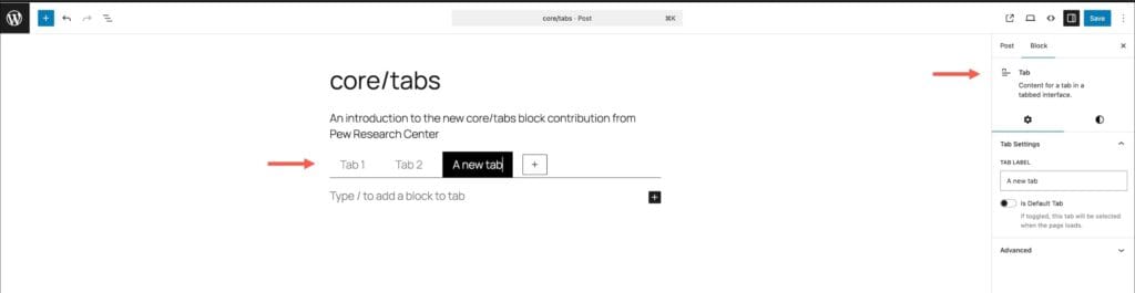 - Tabs-Block für auf mehrere Reiter verteilte Inhalte.