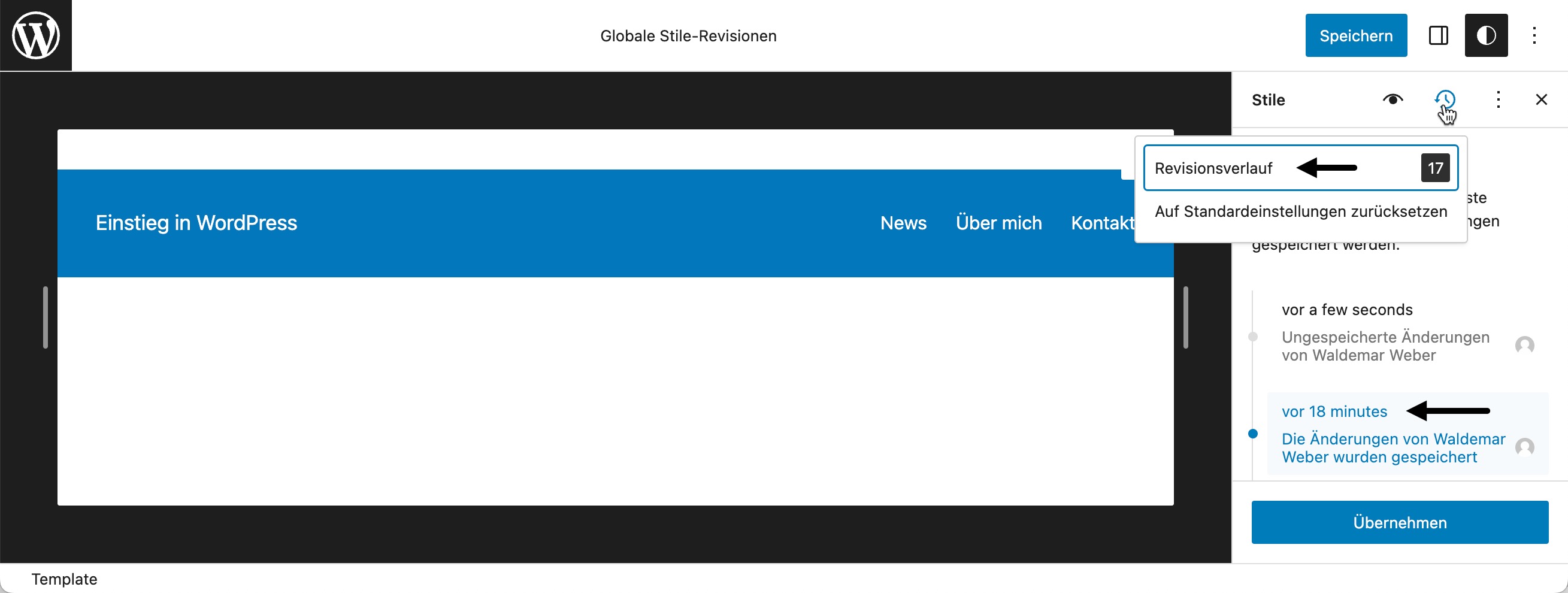 Der Revisionsverlauf zeigt eine Zeitleiste mit allen Änderungen. Wenn Sie eine Änderung markieren, zeigt WordPress links live den Stand der Website zu diesen Zeitpunkt.