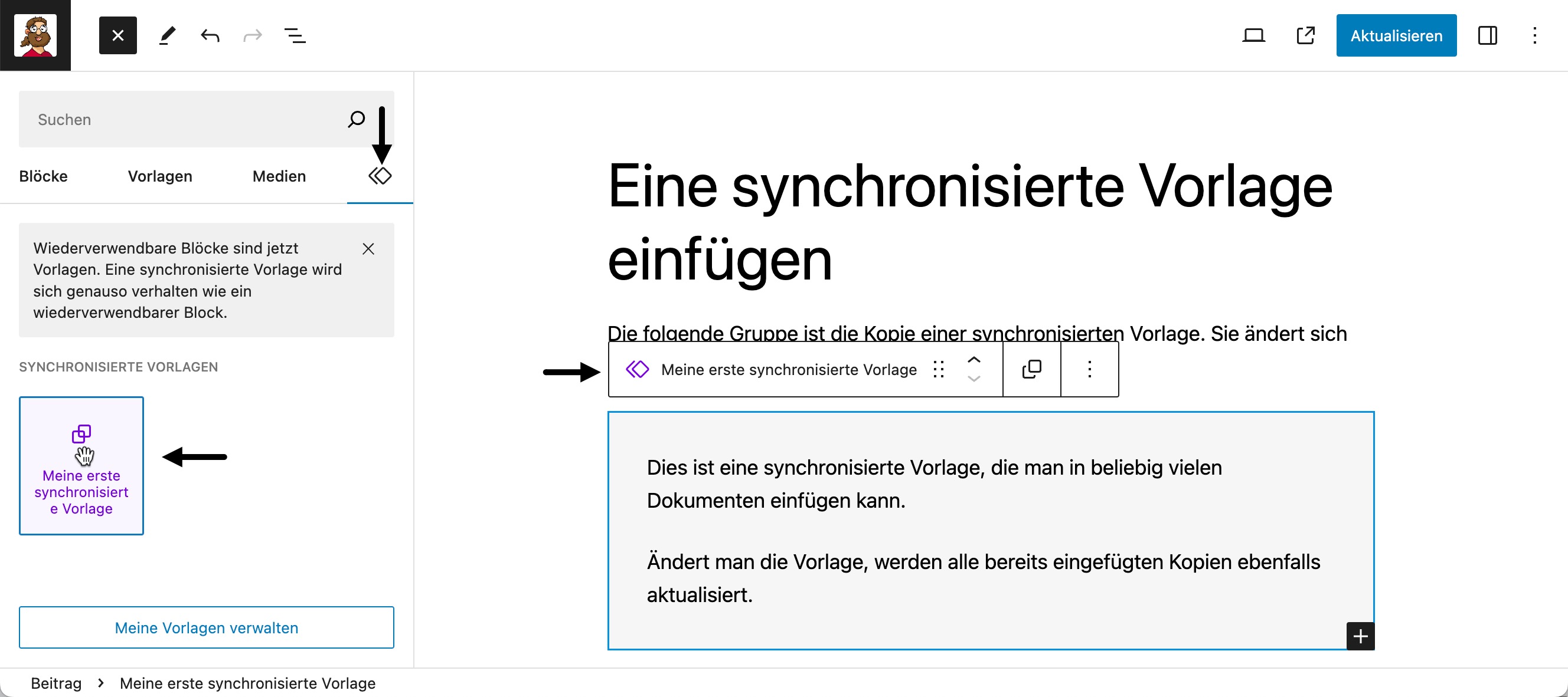 »Wiederverwendbare Blöcke« sind jetzt »Synchroniserte Vorlagen«